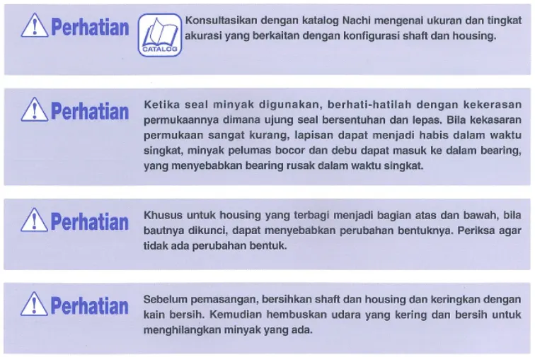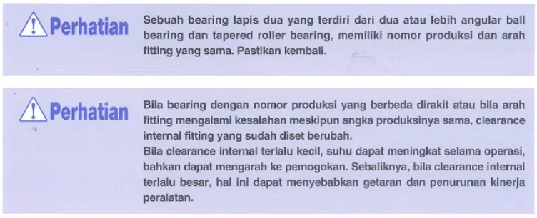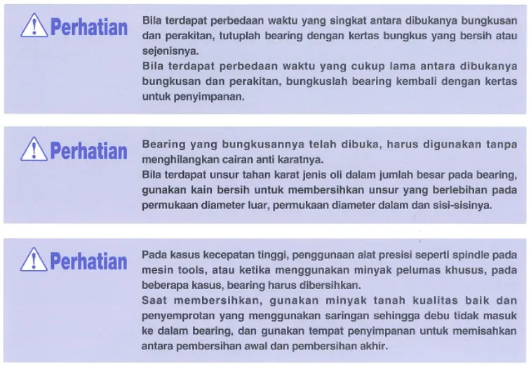 Bearing sangat sensitif terhadap debu dan lembab. Jangan membuka bungkusan bearing kecuali akan memasangnya.